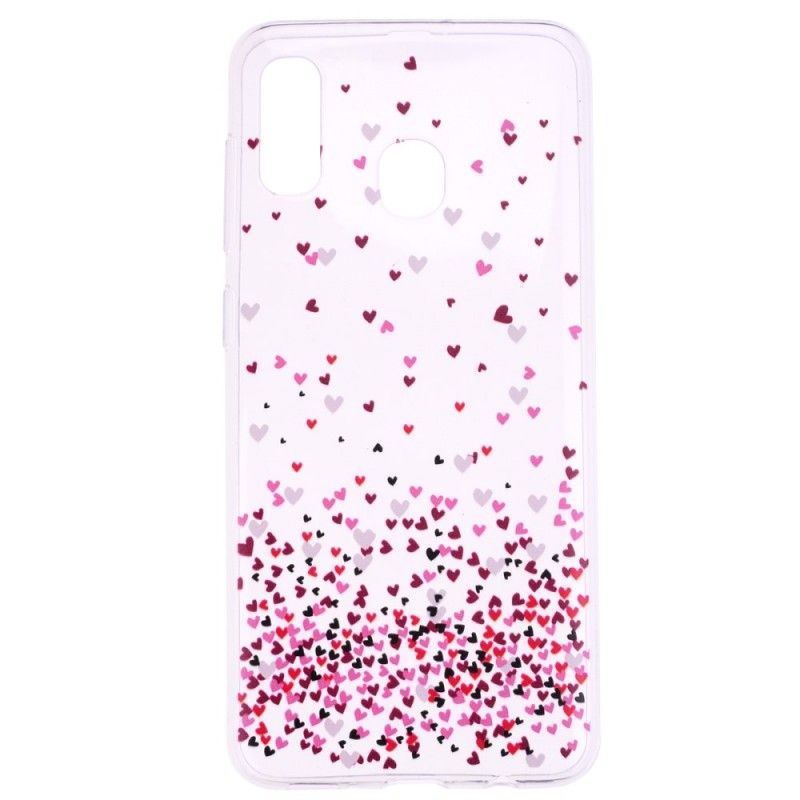 Läpinäkyvä kuori, johon on piirretty useita punaisia sydämiä, joka sulautuu Samsung Galaxy A40: n hienoihin käyriin.