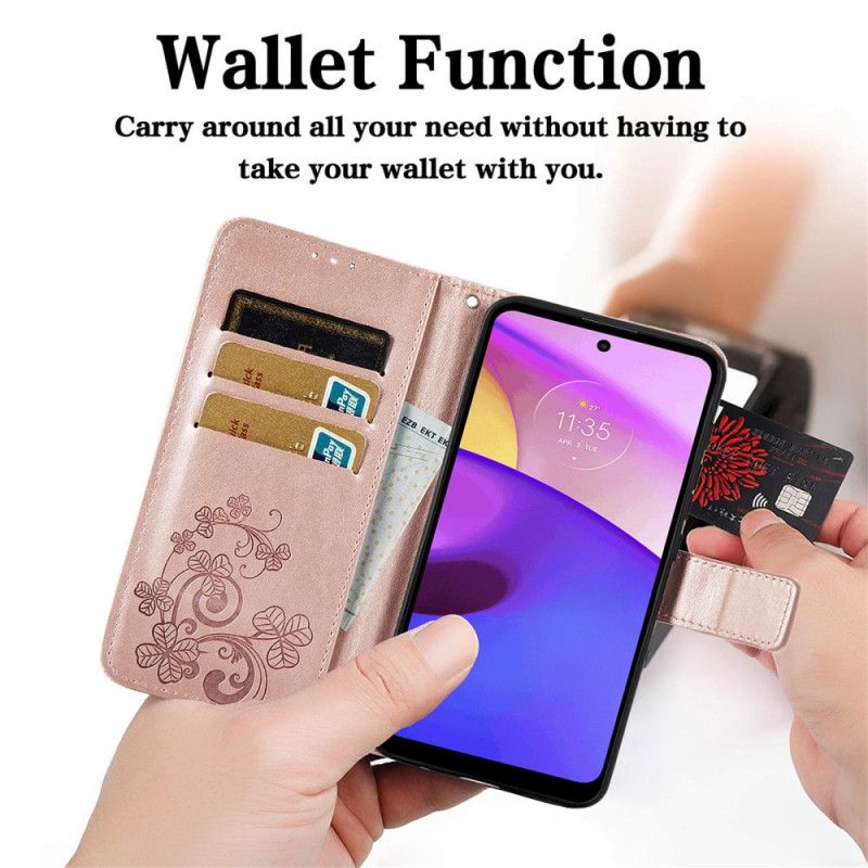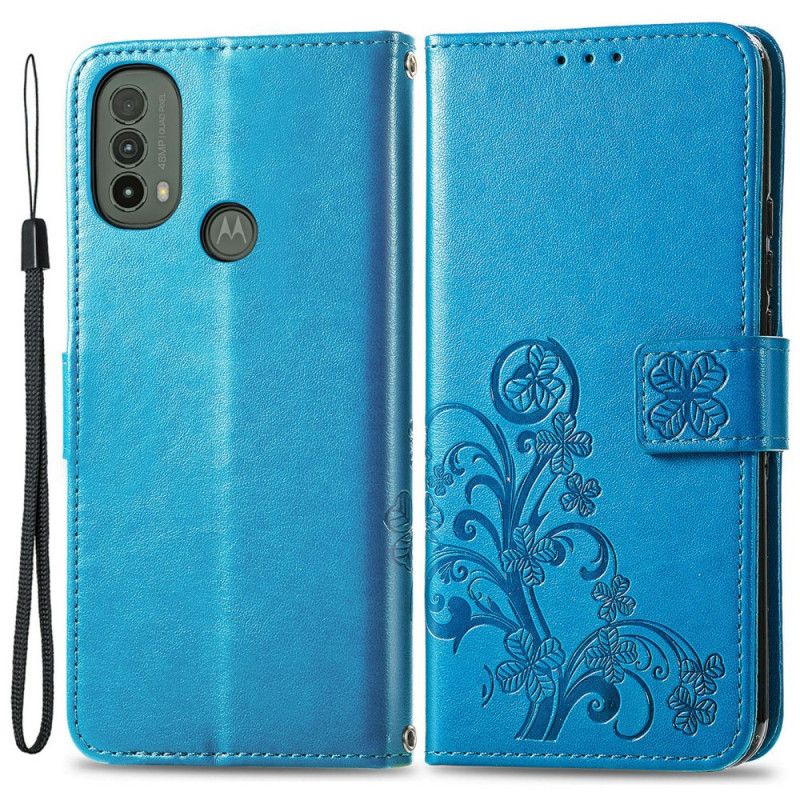 Nelilehtinen apilankansi magneettiläpällä suojaa Moto E40 / E30 / E20:tä.