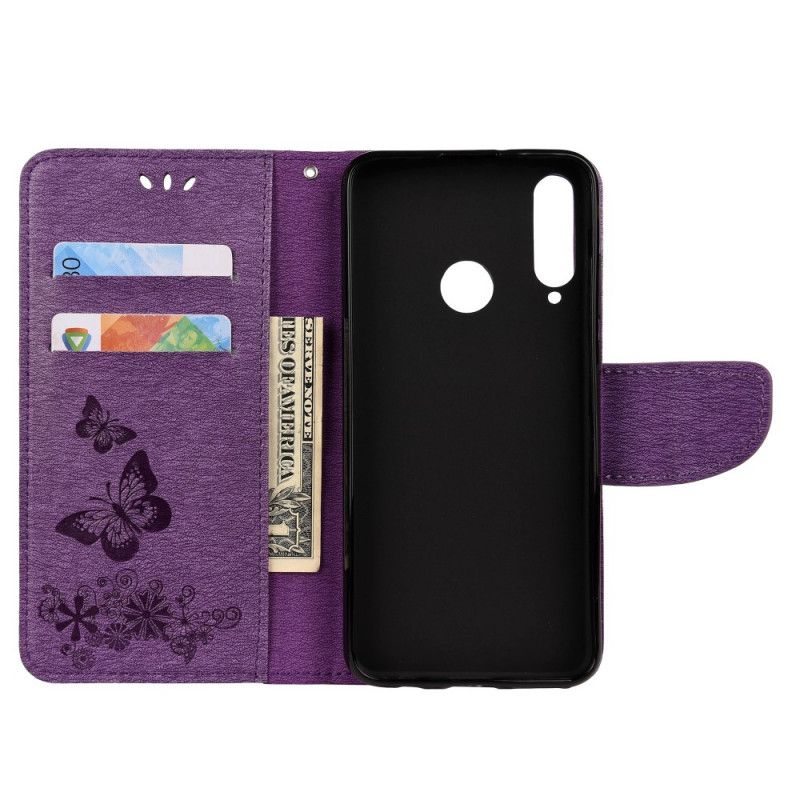 Huippuluokan tekonahkakotelo, koristeltu kauniilla perhosilla, Huawei Y6p: lle, jossa on erittäin hyödyllinen hihna kuljetusta varten.