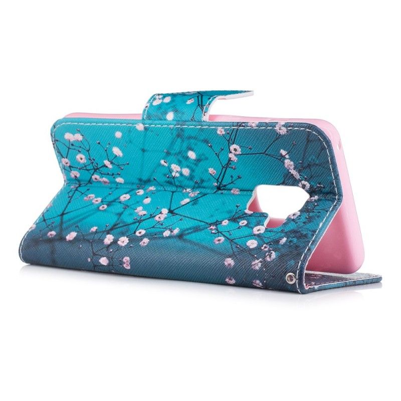 Kukkiva puu sinivihreällä pohjalla suojaamaan Samsung Galaxy A8 2018: ta tyylikkäästi.