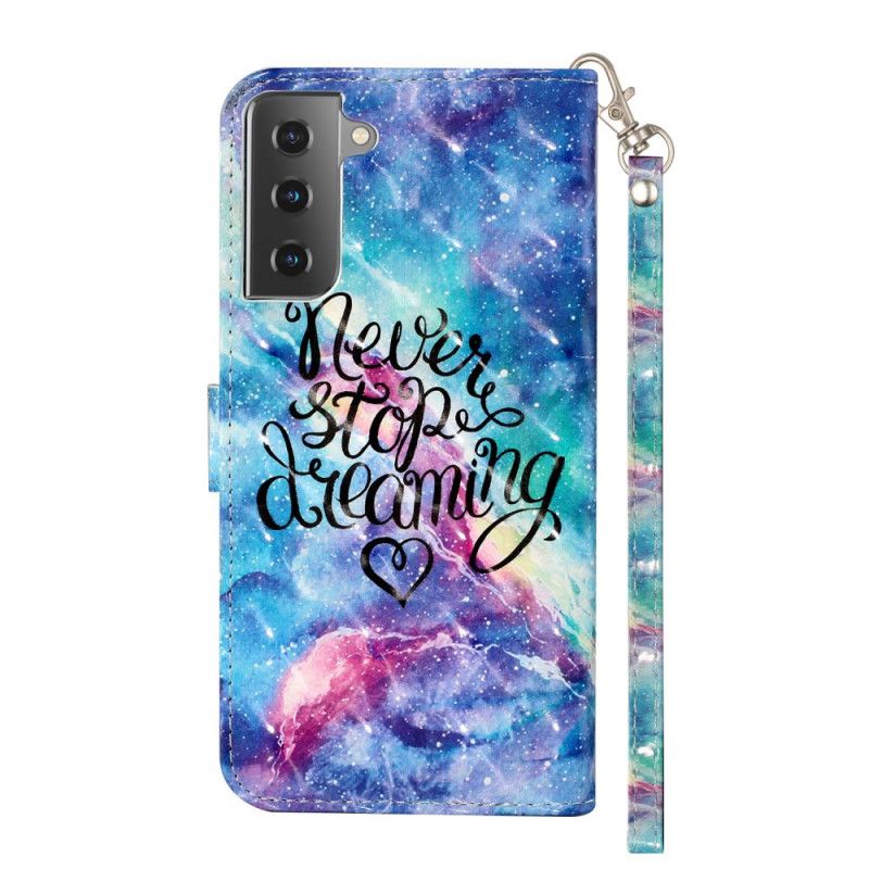 Samsung Galaxy S21 5G on erittäin hyvin kiinnitetty tällä Light Spot Never Stop Dreaming -nahkakotelolla, jonka mukana tulee kaulanauha.