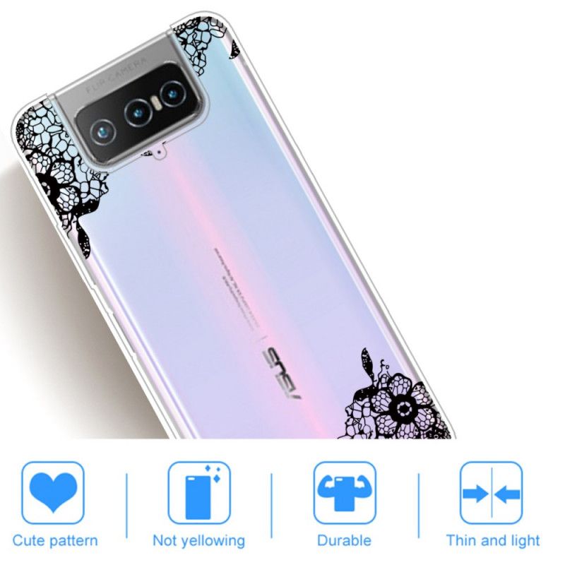 Fine Lace -kuori, läpinäkyvä joustava silikoni, tarjoaa hienon ja tyylikkään suojan Asus ZemFone 7/7 Pro -laitteellesi.>Helppo asentaa, se suojaa takaosan, reunat ja linssin kolhuilta, naarmuilta ja pölyltä ja jättää helpon pääsyn portteihin.