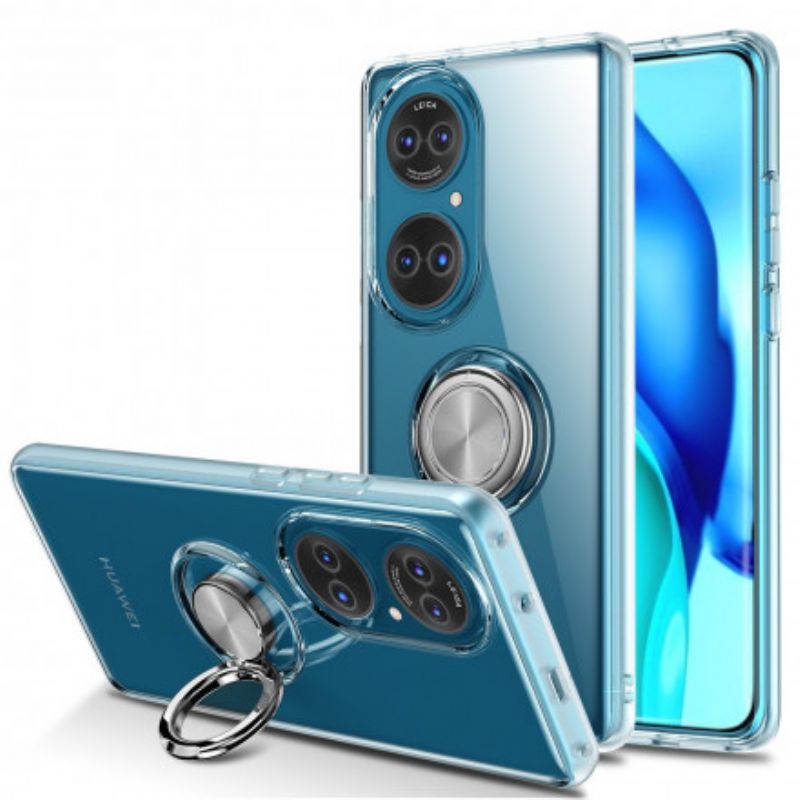 Simple läpinäkyvä kotelo, jossa on metallinen tukirengas, suojaa Huawei P50:tä samalla, kun kannat sitä sormella.