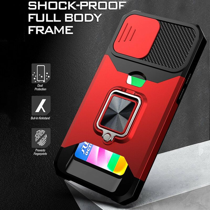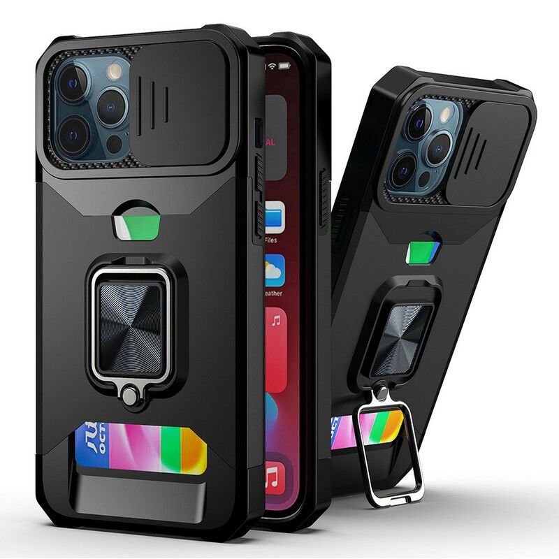 Suojaa iPhone 13 Pro Max -puhelimesi tällä superkotelolla, joka on varustettu korttitelineellä, tukirenkaalla ja vetoketjullisella linssisuojalla.