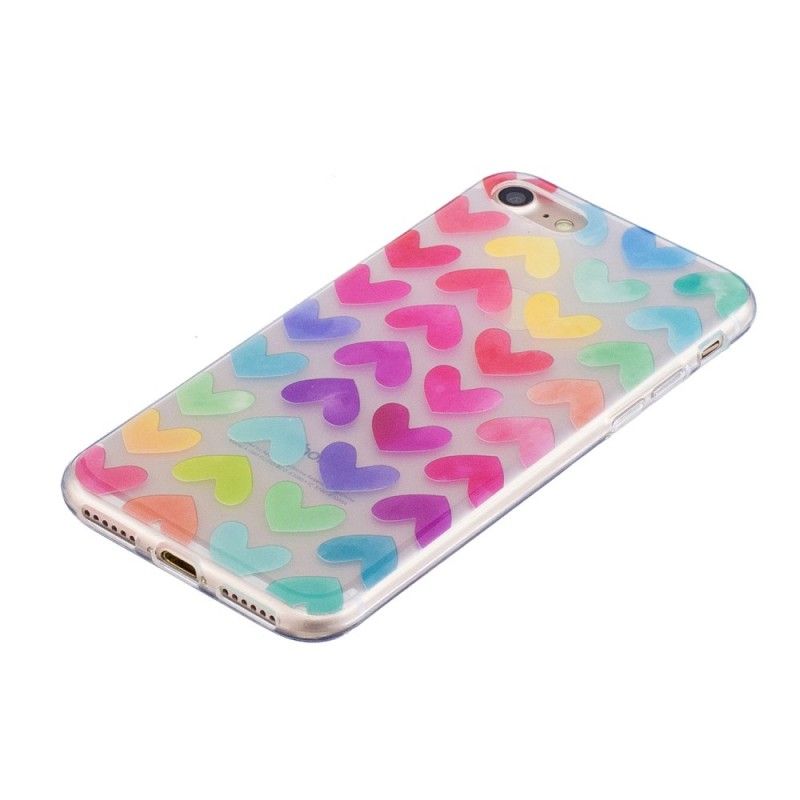 Läpinäkyvä kuori, johon on kiinnitetty useita sydämiä, joka sulautuu iPhone SE 2/8 / 7: n hienoihin käyriin.