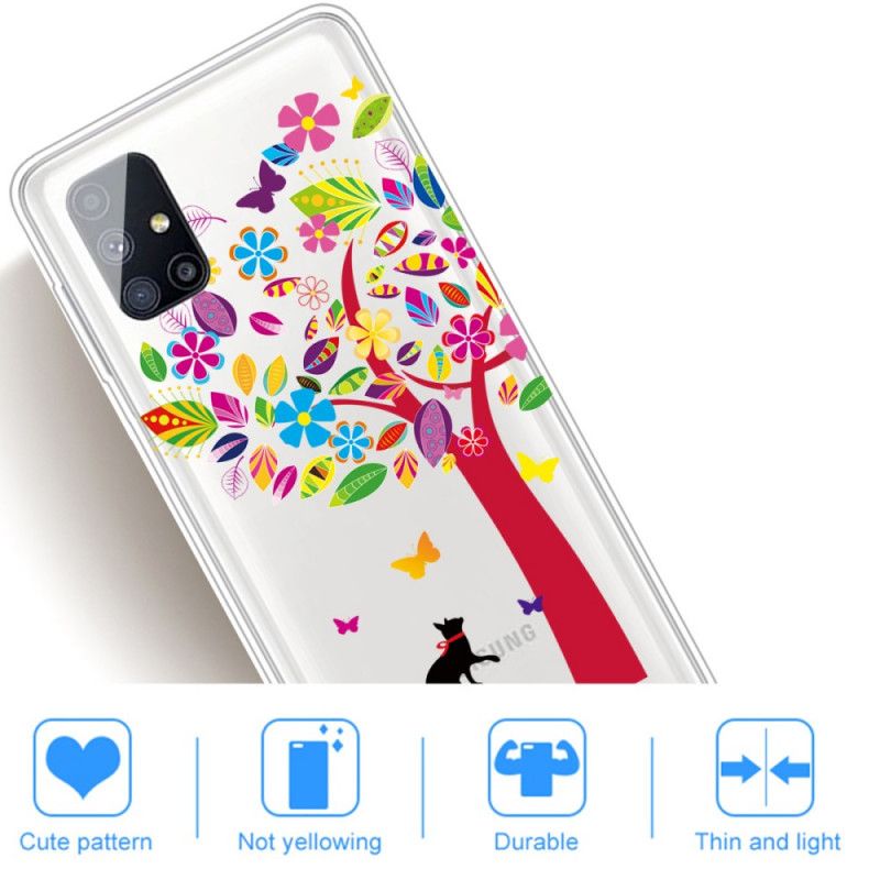 Läpinäkyvä kissa, joka on valmistettu joustavasta silikonista, puun alla, sopii erinomaisesti Samsung Galaxy M51: n kiinnittämiseen kissan ystäville.