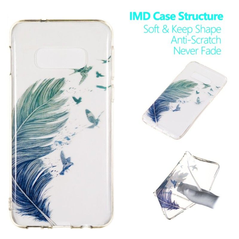 Tämä kotelo on läpinäkyvä, vaaleanvärisillä höyhenillä varustettu kuvio, yhtä esteettinen kuin kestäväkin, on suunniteltu Samsung Galaxy S10e -puhelimelle.