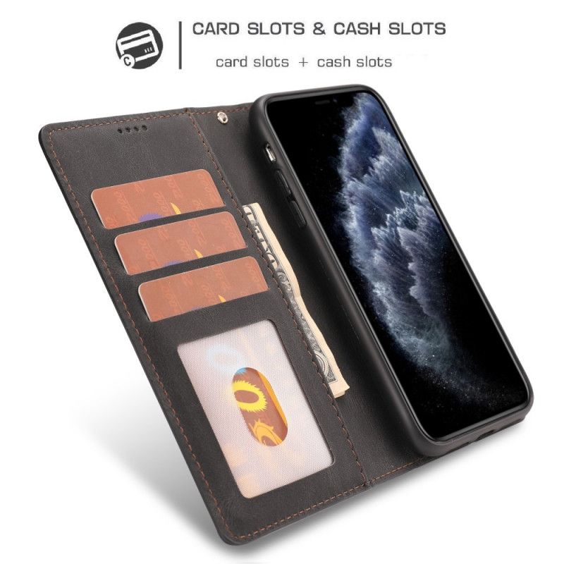 iPhone 12 Pro Max on erittäin hyvä kiinnitetty tällä klassisella retro-tyylisellä nahkapäällysteellä, joka toimii lompakkona.
